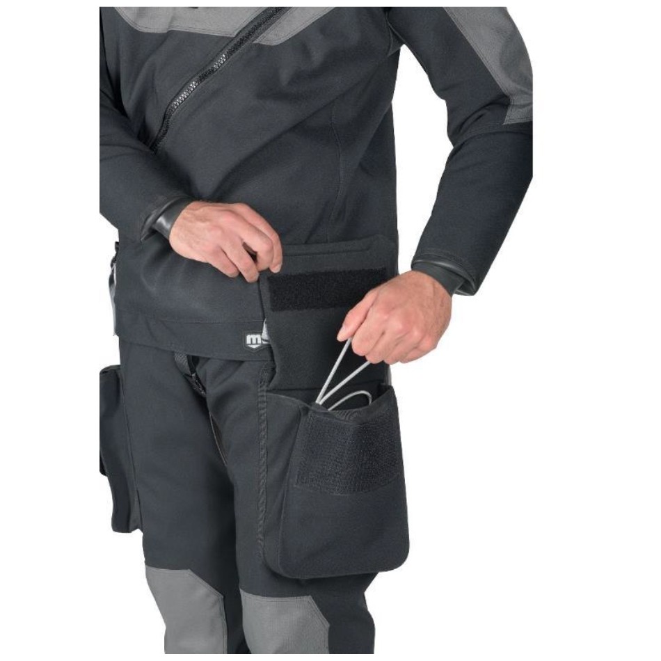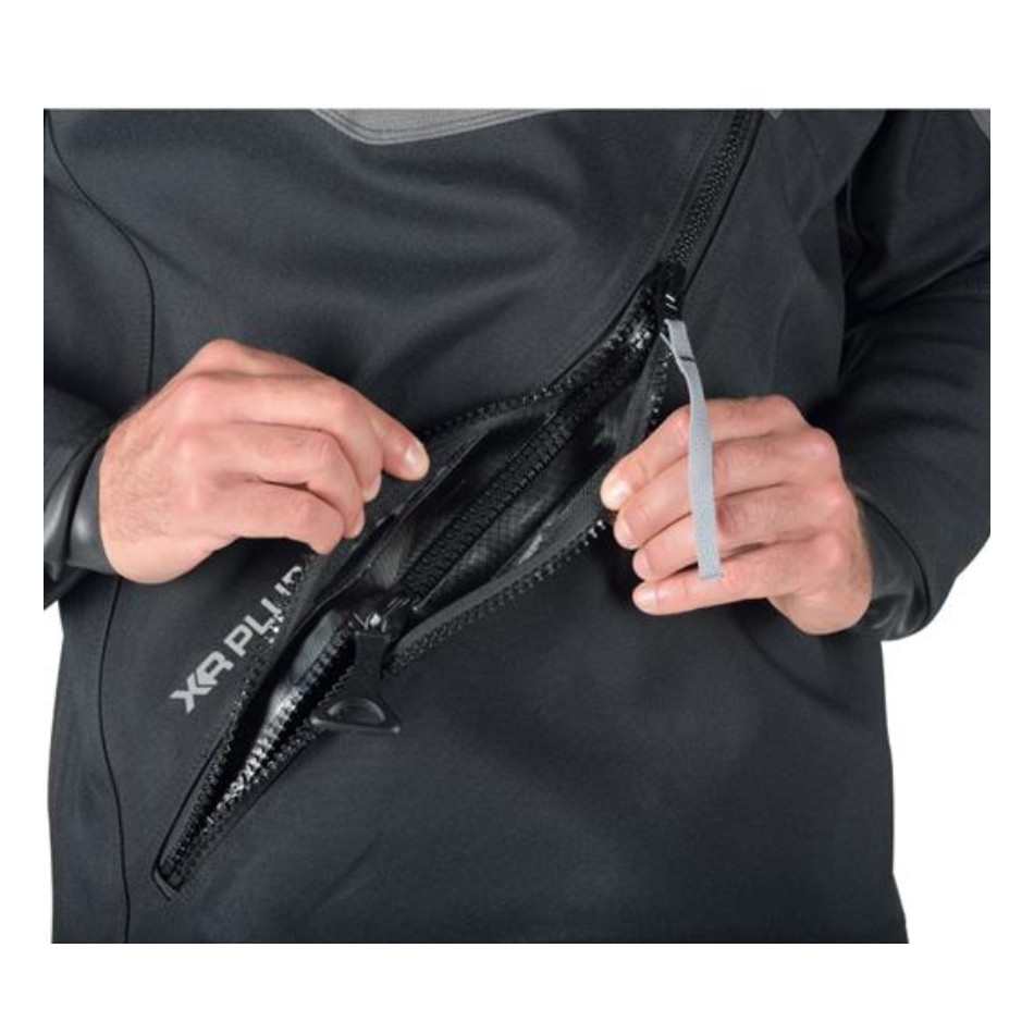 The drysuit features a front waterproof zipper covered by a protective zipper. These two zippers are slightly offset to provide: