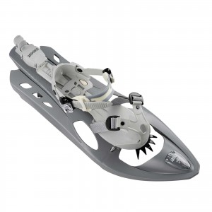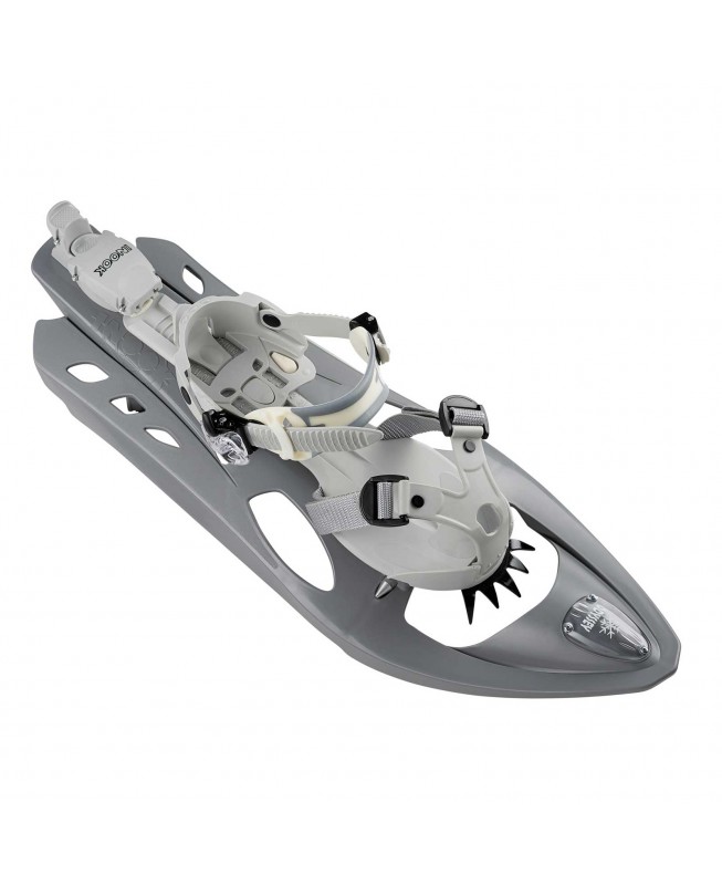 The profile of the frame shows a turned-up bow to keep the snowshoe constantly above the snow. The rear openings avoid any snow accumulation above and under the frame.