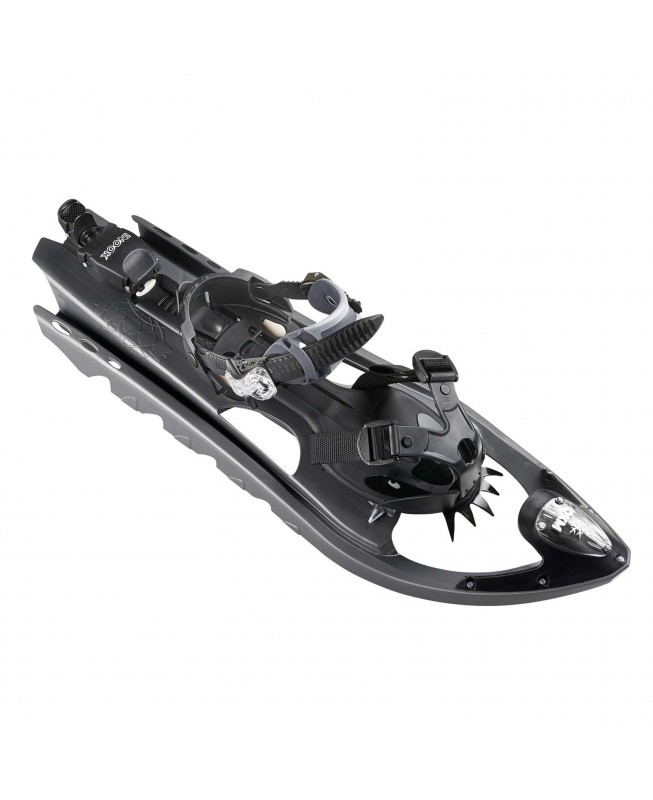 The profile of the frame shows a turned-up bow to keep the snowshoe constantly above the snow. The rear openings avoid any snow accumulation above and under the frame.