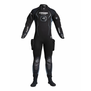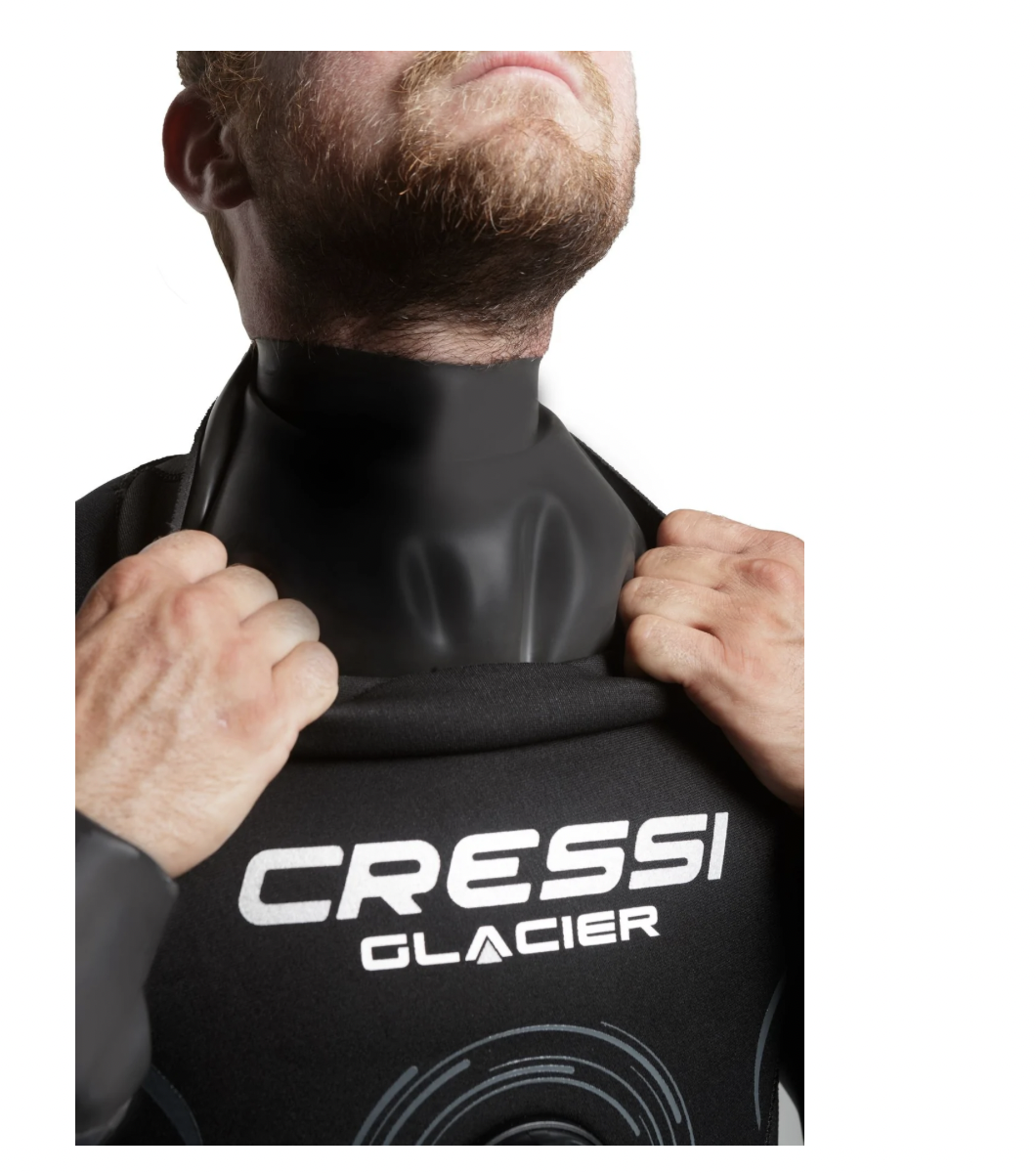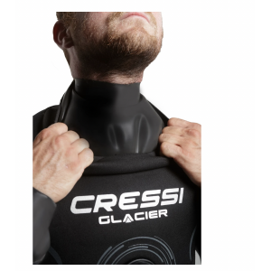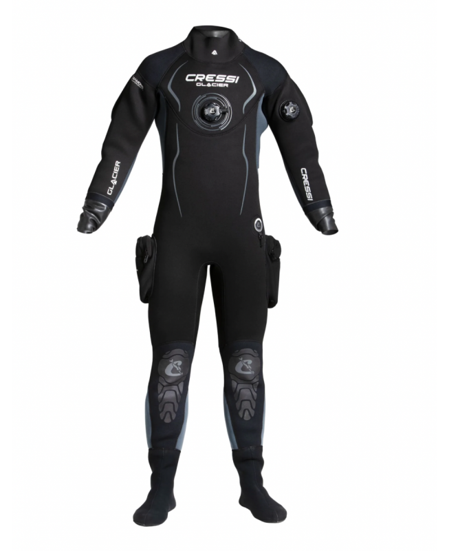 Glacier è una muta stagna in neoprene precompresso ad alta densità da 4 mm. La caratteristica principale della glacier è che collo e polsini sono realizzati in lattice. Questo garantisce un'ottima tenuta stagna della muta. Collo e polsini possono essere adattati con precisione alla propria misura tagliandoli, per il massimo comfort. Inoltre sono sostituibili in caso di usura o strappo accidentale. Glacier è dotata di una seconda protezione intorno in neoprene da 1,5 mm intorno al collo. Questo garantisce un'adeguata protezione termica anche in presenza di un collo in lattice. Le spalle, la schiena, la zona lombare e le ginocchia sono rinforzate con materiale x-diamond, rendendo la muta adatta all'uso intensivo e resistente all'usura. I calzari sono realizzati in morbido neoprene elastico per adattarsi ad ogni misura. All'interno due robuste bretelle tengono la muta in posizione quando è aperta o indossata solo nella parte inferiore. La robusta zip è protetta da un lembo in neoprene. La valvola di carico è azionata tramite un tasto laterale mentre quella di scarico è regolabile. Glacier è dotata di due ampie tasche laterali sulle gambe per poter portare in immersione dell'attrezzatura aggiuntiva