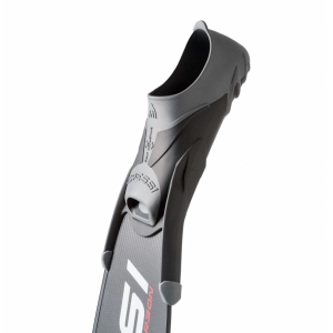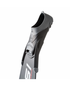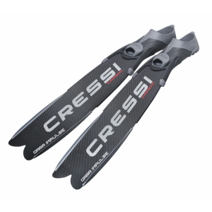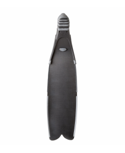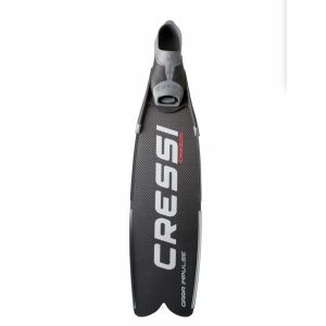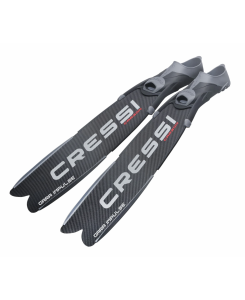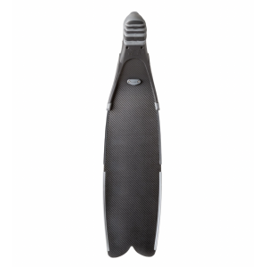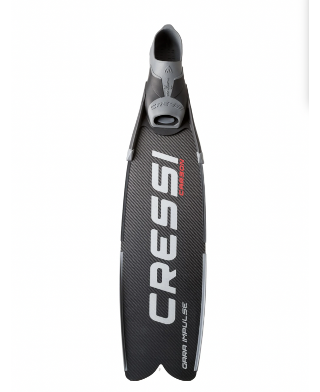 Dopo il progetto impulse siamo riusciti a trasferire gli stessi parametri di progettazione su questa innovativa pala in carbonio, cioè la deformazione ondulatoria a s. Questo particolare movimento permette un accumulo notevole di energia elastica potenziale nella pala, che nella passata di gamba di ritorno si scarica trasformandosi in spinta. L’effetto è stato raggiunto utilizzando un programma per calcolo degli elementi finiti, che ha permesso di sfruttare al massimo le prestazioni offerte dalla fibra in carbonio. La pala è fatta in fibra di carbonio al 100% con un angolo di 29°. La fibra viene importata dal giappone, prodotta dalla mitsubishi con rigidissimi protocolli qualitativi, per poi ottenere il foglio sagomato e processato in uno stabilimento specializzato in turchia. La pala viene completata con un processo industriale di co-stampaggio realizzato a genova nello stabilimento cressi. Questa elevata adesione chimica ottenuta tra pala e longherone sino a fare corpo unico ha permesso di eliminare la colla, la quale per la sua rigidità non permetteva alla pala in carbonio di flettere naturalmente. La gomma termoplastica usata per i longheroni anti-dérapage è estremamente flessibile e morbida per non sminuire le caratteristiche intrinseche del carbonio. La pala così fatta è meno fragile e più protetta dalla gomma. Il risultato finale è una pinna molto leggera, che riesce a sfruttare la massima flessione del carbonio in ogni suo millimetro quadrato