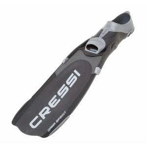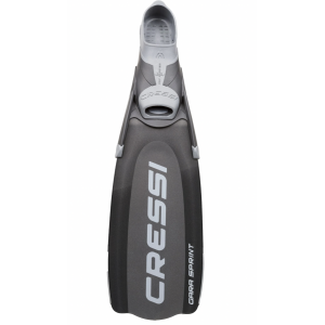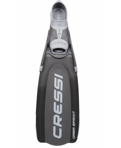 La nuova pinna gara turbo sprint è una versione più corta della gara turbo. La sprint dovrebbe coprire le necessità degli apneisti e dei pescatori subacquei che praticano questo sport in inverno e quando non si rende necessario indossare una pinna così lunga come la impulse. Entrambe le pinne sono state progettate con costosi software di calcolo a elementi finiti, che permettono di definire sezioni molto complesse e altrettanto performanti. La pala della sprint, come quella della impulse, è fatta in un unico materiale elastomerico termoplastico, anche se possiamo definire meglio la sua struttura parlando di un substrato angolato e di un soprastrato. Il substrato segue la forma e le dimensioni di quasi tutta la pala, ha uno spessore uniforme e presenta un’ala longitudinale flessibile di propulsione con una lunghezza variabile. Se smontate, la pala e la scarpetta occupano l’ingombro di una normale pinna da snorkeling